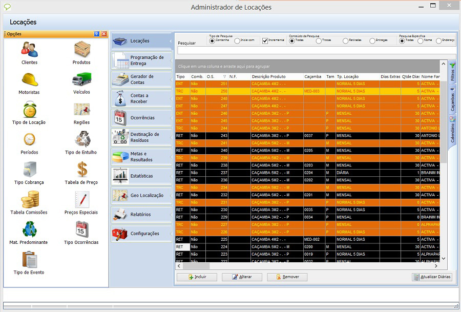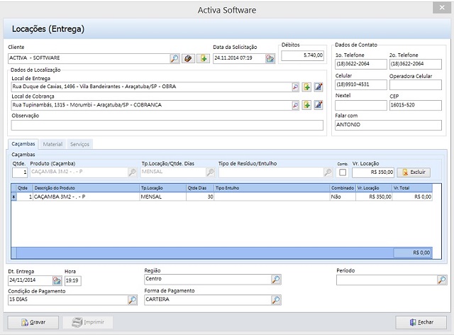 Completo e descomplicado o Activa Commerce é o sistema de automação de locadora de caçambas estacionárias e de prestação de serviços com a melhor relação custo/benefício do mercado. O Activa Commerce foi desenvolvido com um conceito empresarial, facilitando ao usuário o seu manuseio, porém permitindo ao administrador total controle sobre tudo o que se passa durante o processo de suas locações e de prestação de serviços de sua empresa, principalmente o controle de estoque e o controle financeiro, que são dois dos ítens mais importantes para a elaboração de um bom programa ou sistema de locadora.