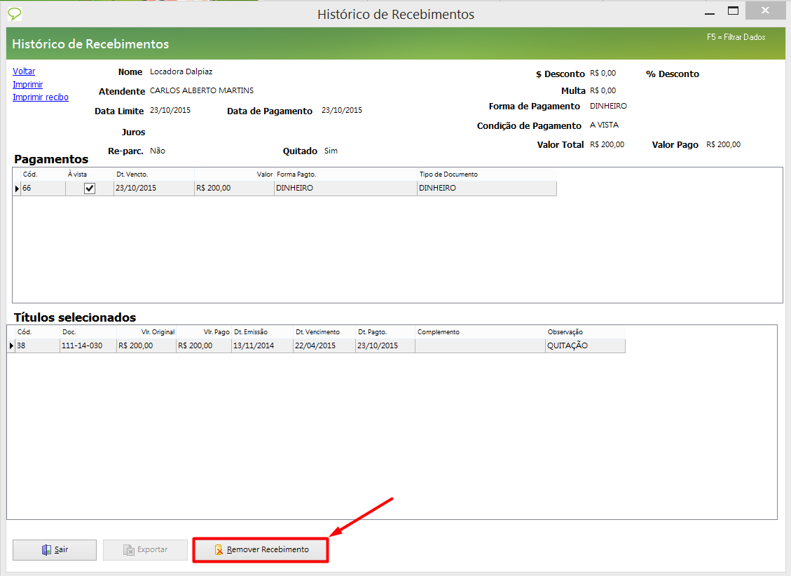 Selecionar o registro do histórico de baixa a ser estornado. Clique em remover recebimento.